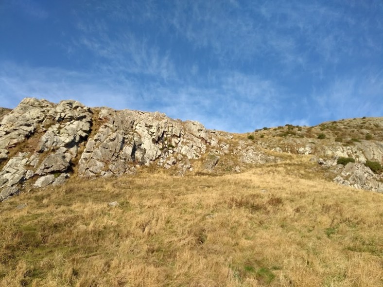 On reaching a level, grassy area – we would not be going any higher today – Roxy & I read through the early 12th century ‘Fragmentary Life of Saint Kentigern,’ which tells the story of how Princess Thaney was flung from those very tall, very jaggy cliffs above us 1500 years ago.