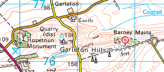 Hopping over the stile, one reaches a wide smooth field, the gentle rise of which forms a u-shape against the sky. Turning around & looking backwards; Edinburgh is clearly visible, while in the foreground the Hopetoun Monument leaps vertically out of Byres Hill. Even closer – just across the road – is the Garleton’s tallest peak, Skid Hill, upon which survive some of the the earthworks of a Gododdin hillfort – the rest have been destroyed by extensive quarrying.