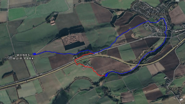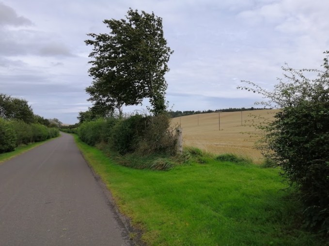 Alas for us, we don’t really want to turn left, but are instead heading towards East Linton. Another alas comes with the complete deficiency of a path network in this area. The images above were taken from the end of the one short stretch of decent track, tho, which fits snughly into the idea of our Heritage Trail. In the distance is the path from Barnes, which hits a busy road. Ideally, the trail would enter the fields, skirting the edges either north at the Cogtail Burn, or to the south, before arriving at the track (blue-staggered route). I think the owners are at Beanston, so lets hope they’re amenable to a wee harmless walkway around the edge of a field.