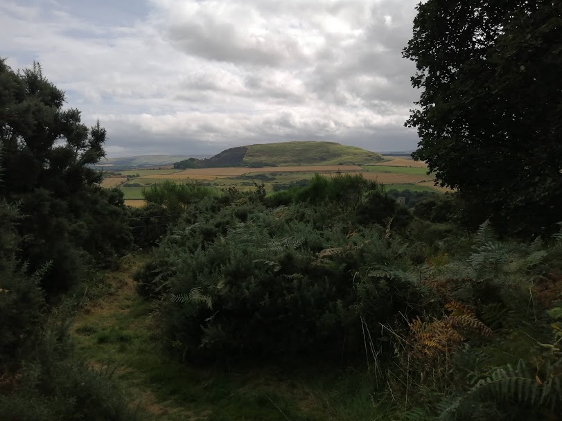 From here the path climbs for almost a mile towards Pencraig, passing a series of different shaped benches plonked Portemeirion style by the path, whereupon entering its wood we find ourselves in Wolfstar territory, East Lothian’s premier field archery club. Just beyond the targets we arrived at a superb spot to view Traprain Law, which shall be the constant centrepiece of the Trail.