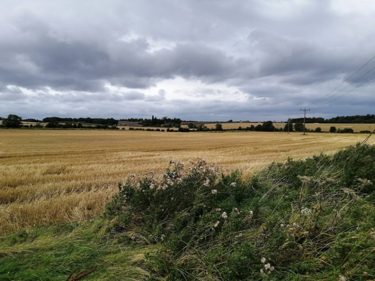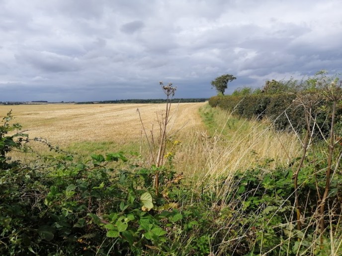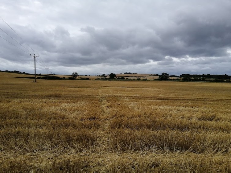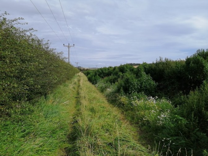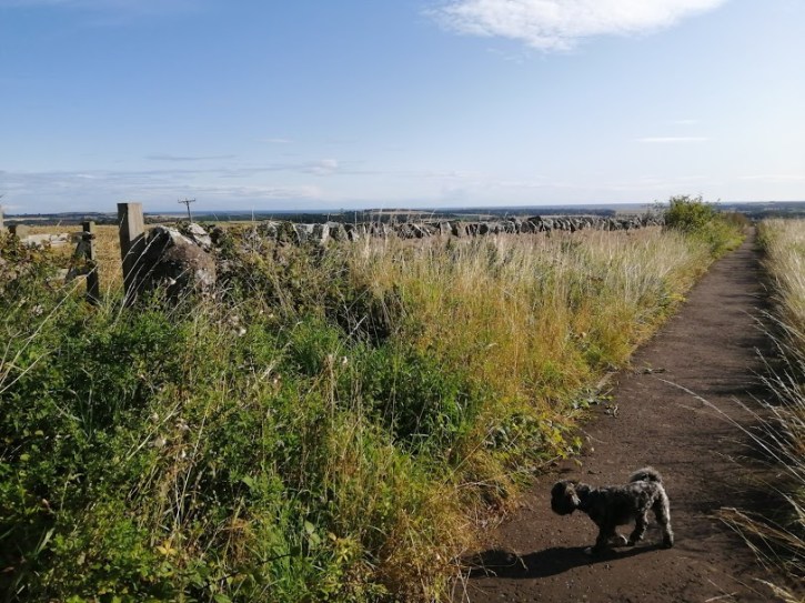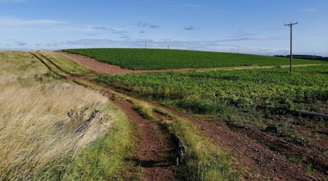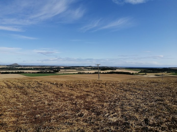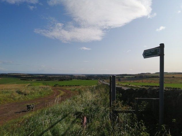 At the western end of Pencraig’s parking spot a path drives thro’ some foliage, before bursting out overlooking the eastern quarter of the county roughly where the Scots appeared backin 1401. There’s a little old gate in the wall to the left which takes you into a field for a bit, or you can just stick to the slightly noiser path. They meet up at the edge of a field – it was potatoes when we in attendance – which has a signpost pointing downhill though the fields towards East Linton. This of course, should be taken.