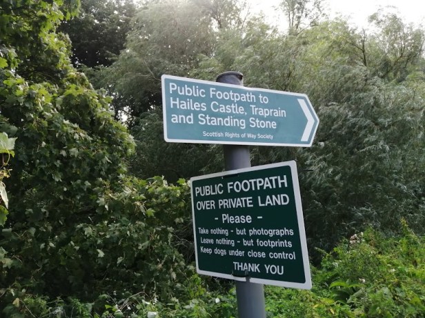 The next morning, or whenever really, follow the high street south to the T-Junction. To the left are the water-tumbling Linn Rocks – a great rush to witness after heavy rains – around which there has been over 5000 years of settlement. We instead are turning right here, crossing the road, passing under the heavy iron railway bridge & walking about 100 meters to a signpost which points towards left Traprain Law & Hailes Castle.