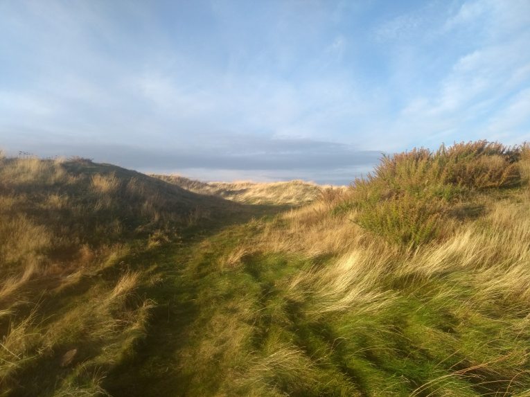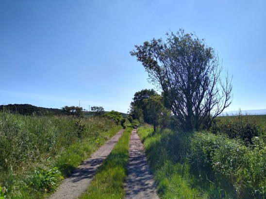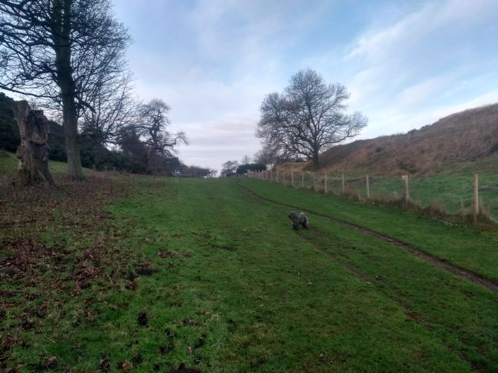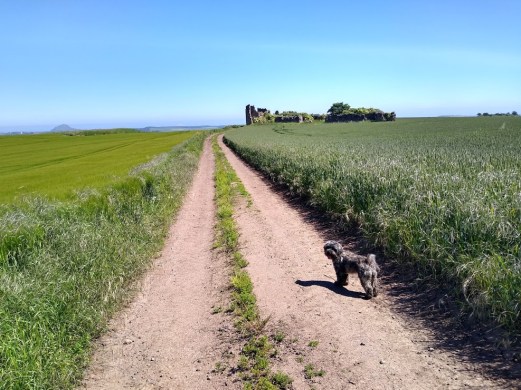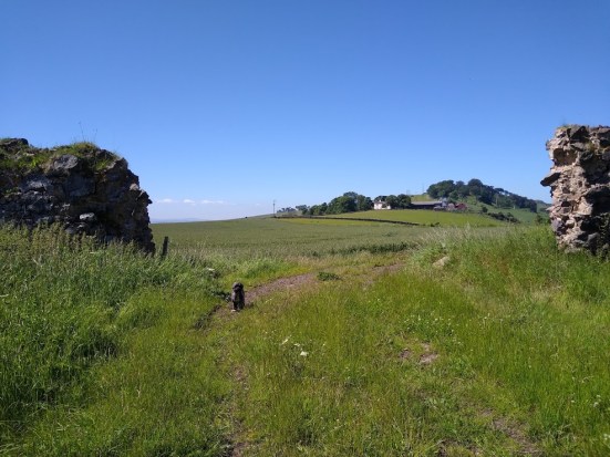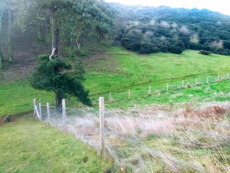 At the top of the slope one reaches Nunraw Estate & its funky Monkey Puzzle trees. One must head left now, by either hopping over the fence – theres a hole for dogs – & skirting the field, or following a very grown-over woodland track once trodden by the Nunraw monks, more of whom I’ll be chatting about next time.