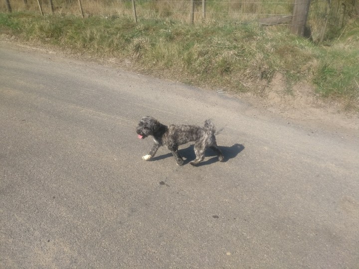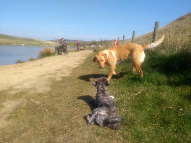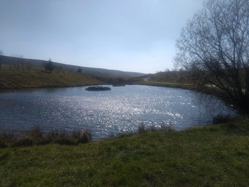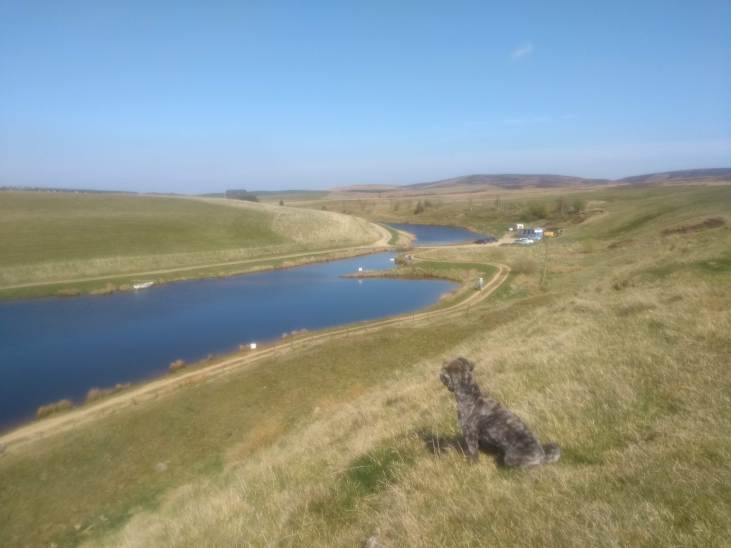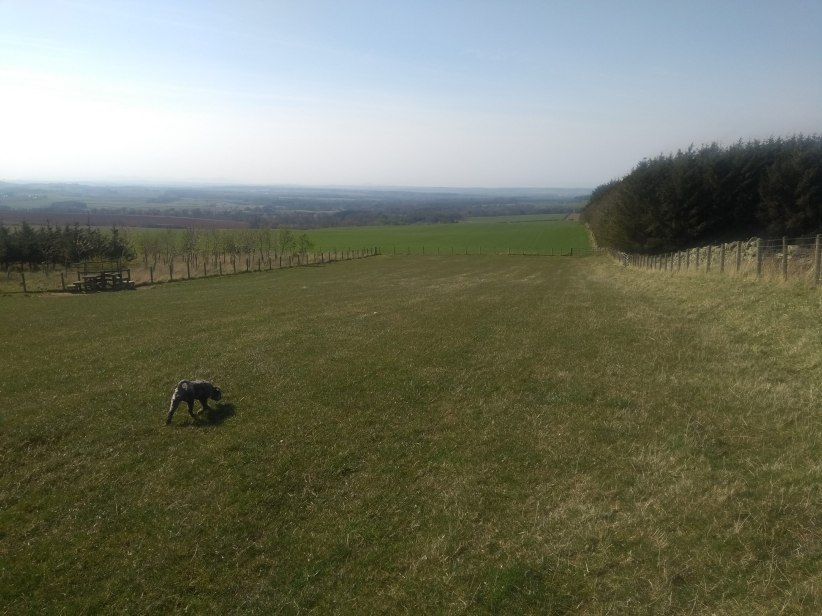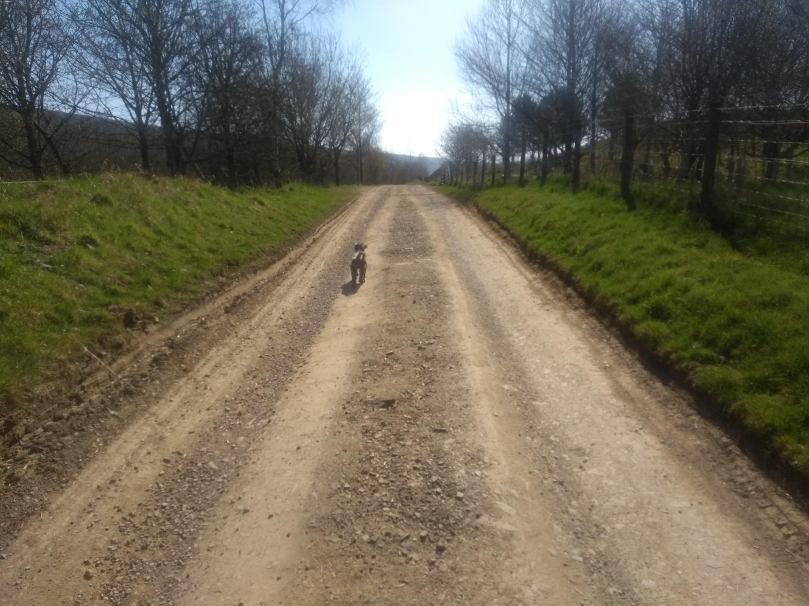I put our guest dog for the walk on her lead for the short distance through the sheepfield to a gate on our right. Once through this I let her off again as we traversed a narrow slip of green between the Grange on our right & a wonderful pond on our left.