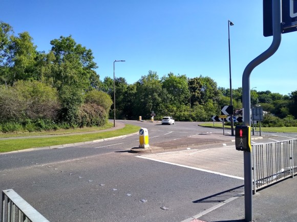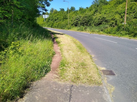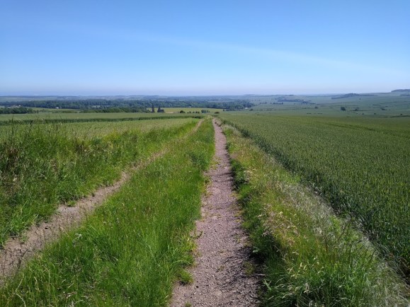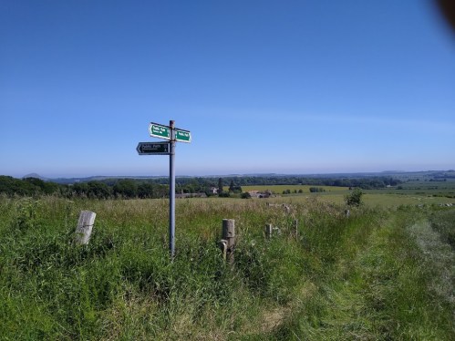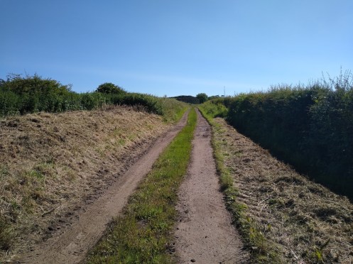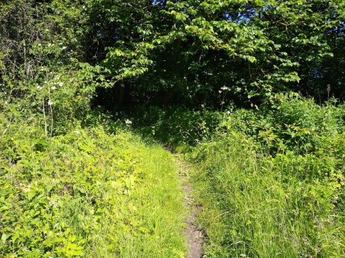 Both routes bring you to a gate, across the road from which is the entrance to some big fields. At this point commences a public pathway marked on all the maps, altho’ difficult to access in the summer – its been left to seed I think.